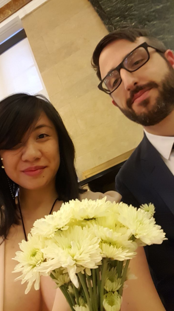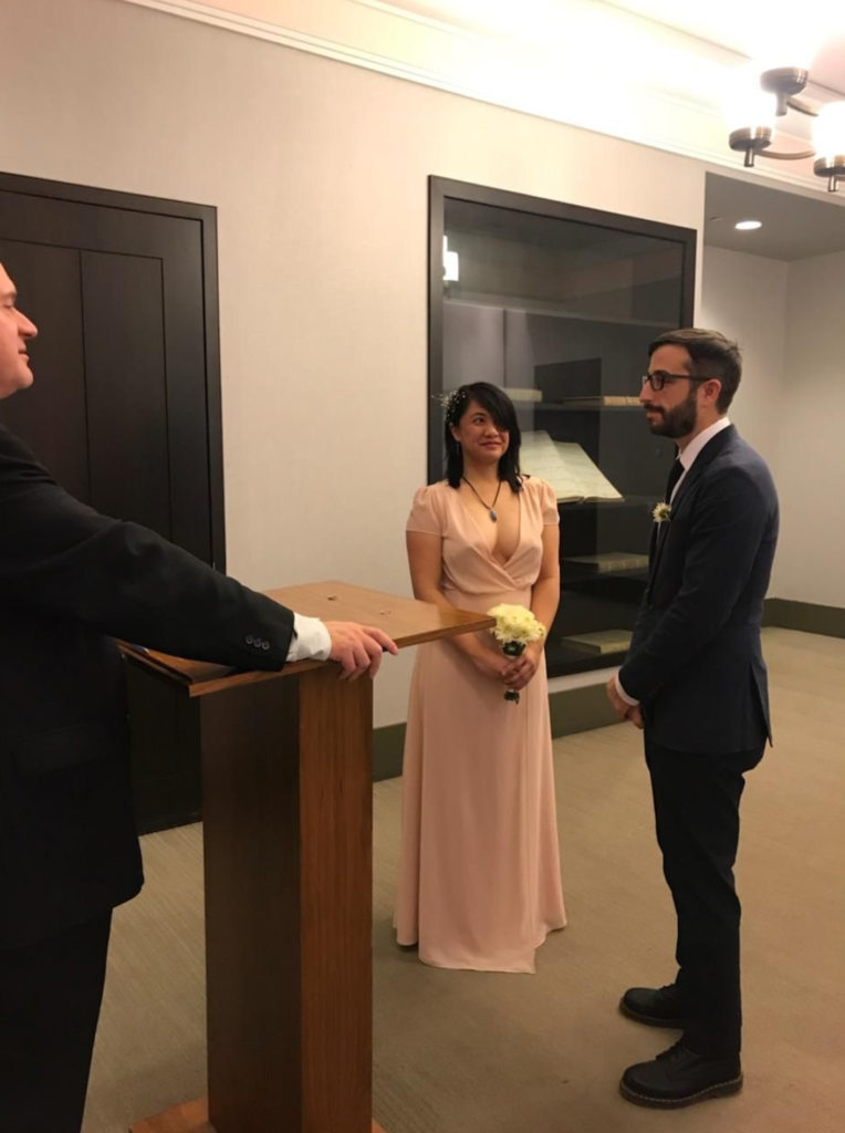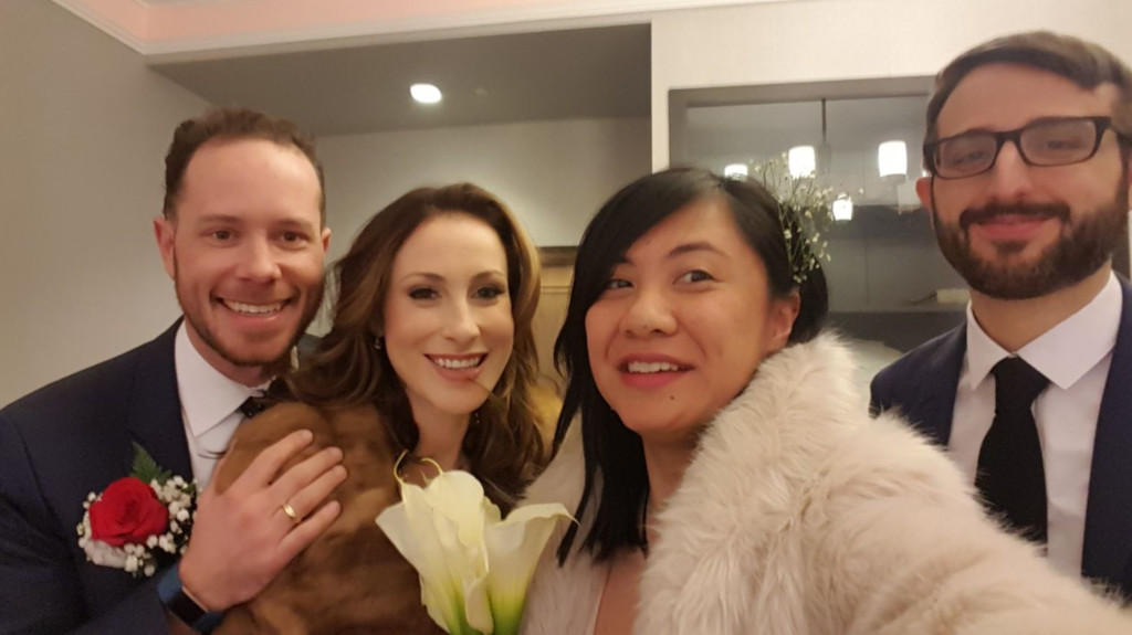 All flights were canceled the days around our wedding day so our guests couldn’t attend. We found a lovely couple and were each other’s witnesses.