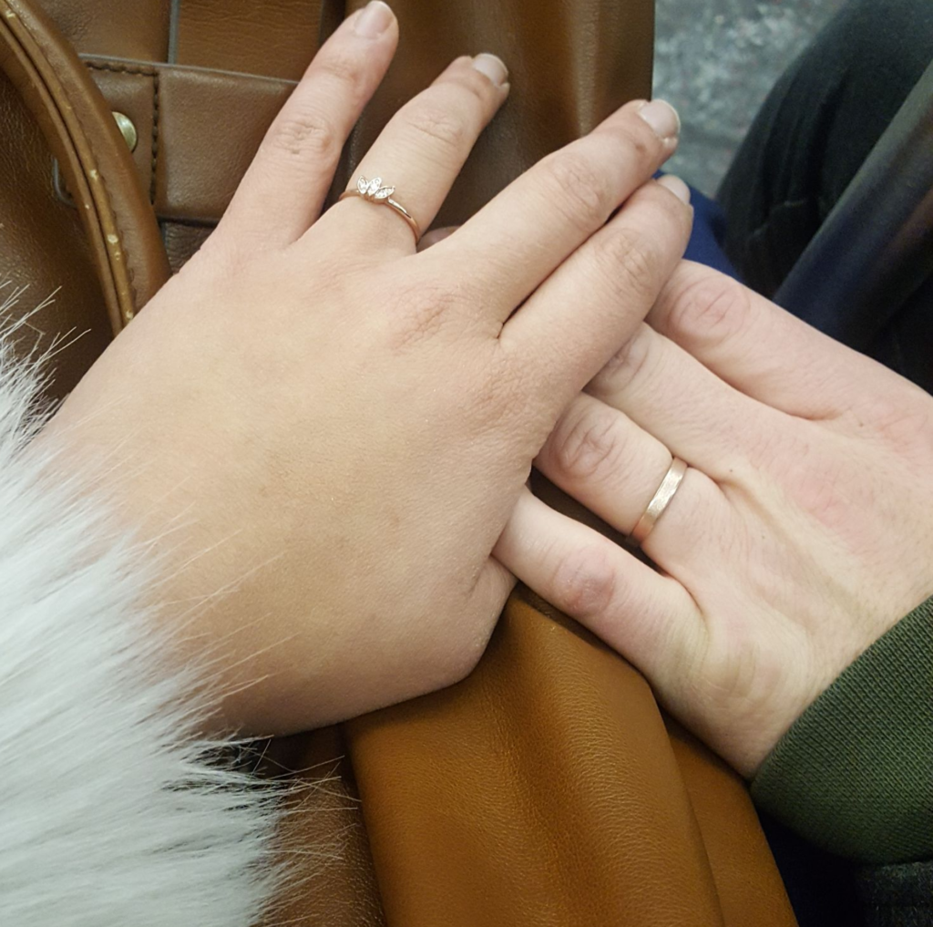 His rose gold ring was custom made by a designer in Brooklyn. We went on a trek through the snow to her studio and she adjusted it to perfection while we ate hamburgers down the street.